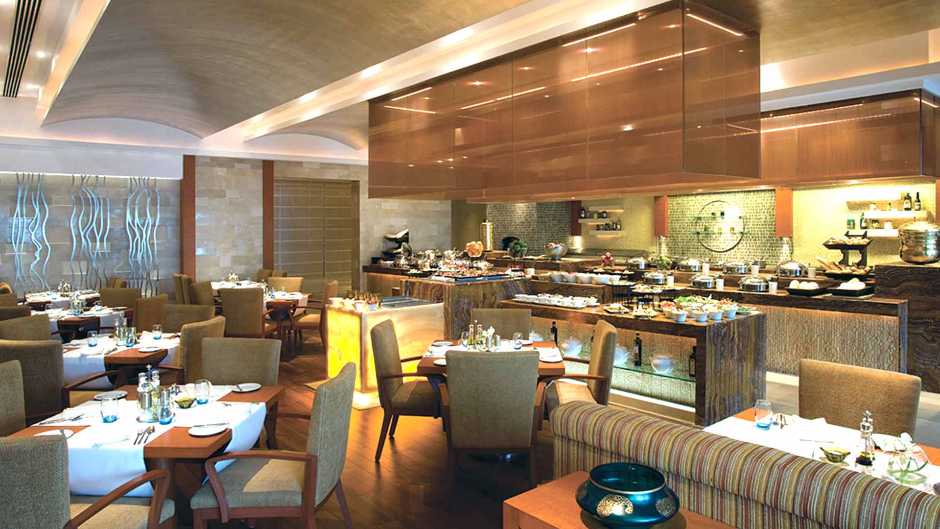 The elaborate spread features a range of options, including Saffron Lassi Shooters, Masala Peanut Sundal, and live counters serving Paani Poori, Goan Rasa Omelette, and sizzling kebabs. The main course offers a vast array of flavors from across India, including Rajasthani Paneer Masala, Mutton Chettinad, and Thalasseri Chicken Biryani.